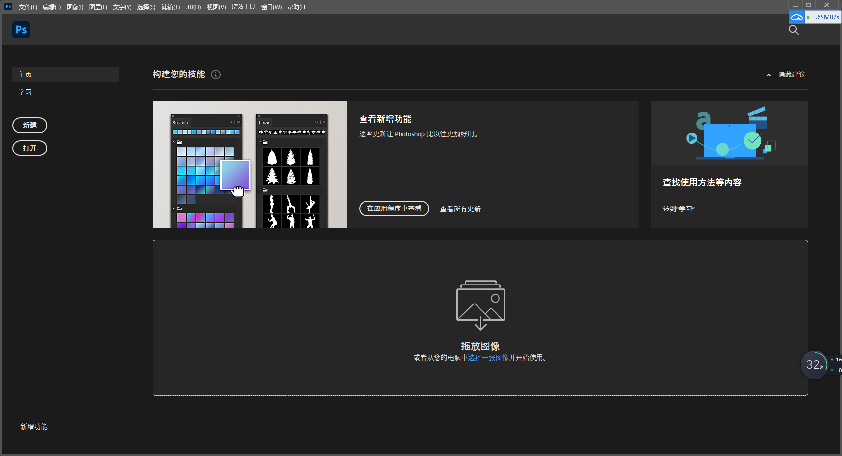 新的“发现”面板将应用程序内学习内容、分步教程和新的强大搜索功能集于一处,为 Photoshop 带来了全新的学习和搜索体验。